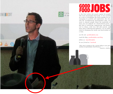 And on a purely selfish note, we were excited to see that Josh Viertel, who spearheaded the USA Regional Meeting, happened to scribble his speech notes on the back of our Good Food Jobs flyer (see photo below). Even from the back of the room I could spot him waving around our bright red logo. Whether or not anyone else noticed it, we appreciated the endorsement.